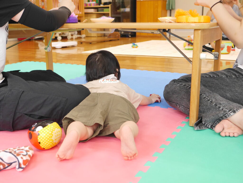 今日、初めましてだったお子様も園長先生と遊んだり、お母様の傍を離れるのはいやだけど、遊びは気になるんだよなぁ~とテーブルの下から様子を伺ったりしていました😊