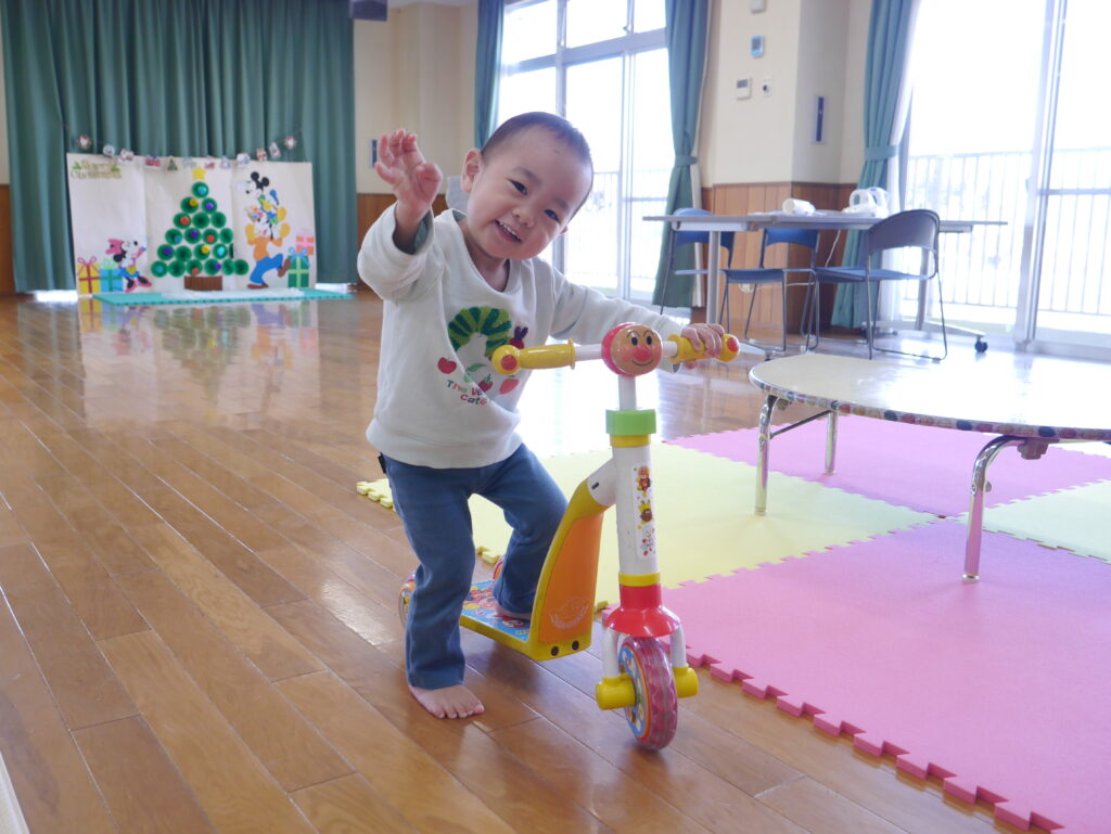 室内で遊べる乗り物を準備していると早速興味津々のKくん!