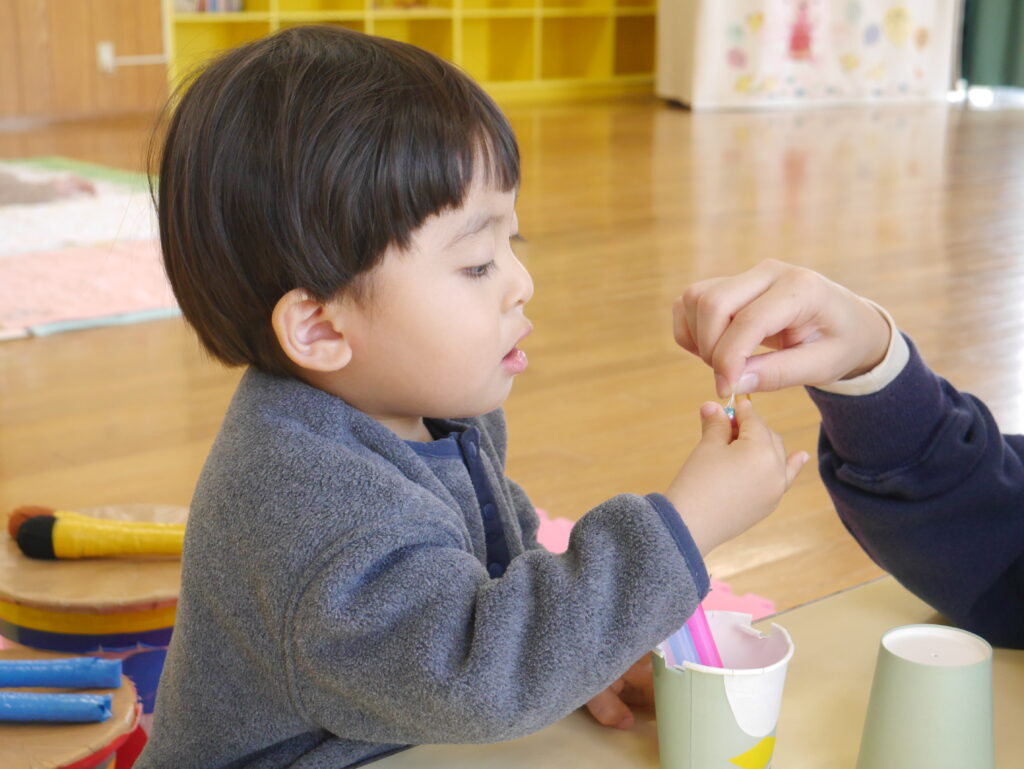 まだ時間があったので、ビーズ遊びを提案してみると、うまく指先を使って遊んでいましたよ✨